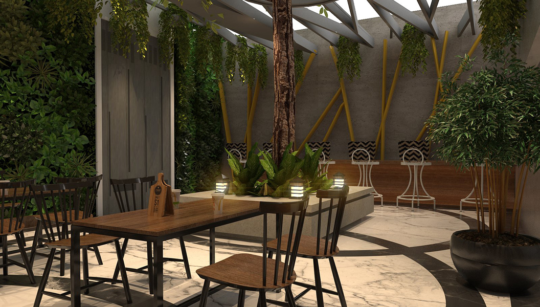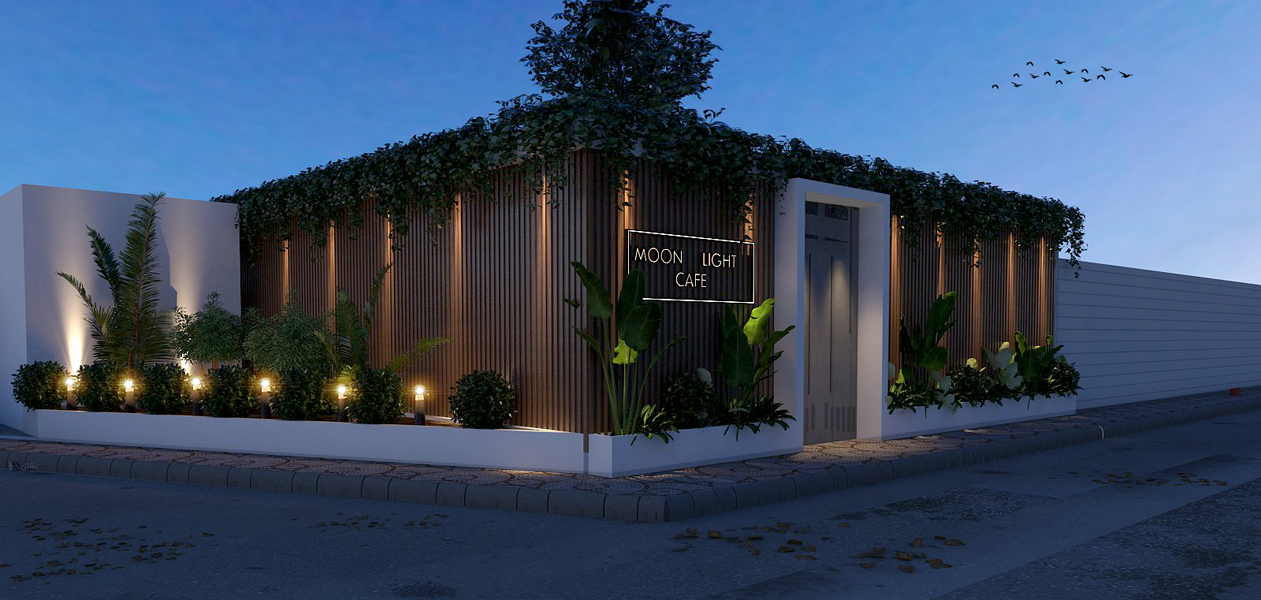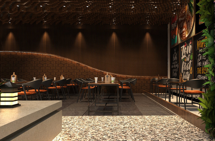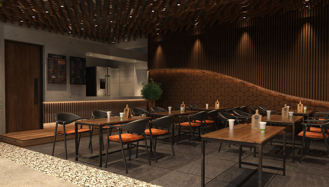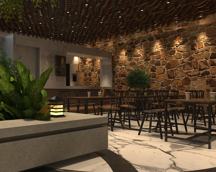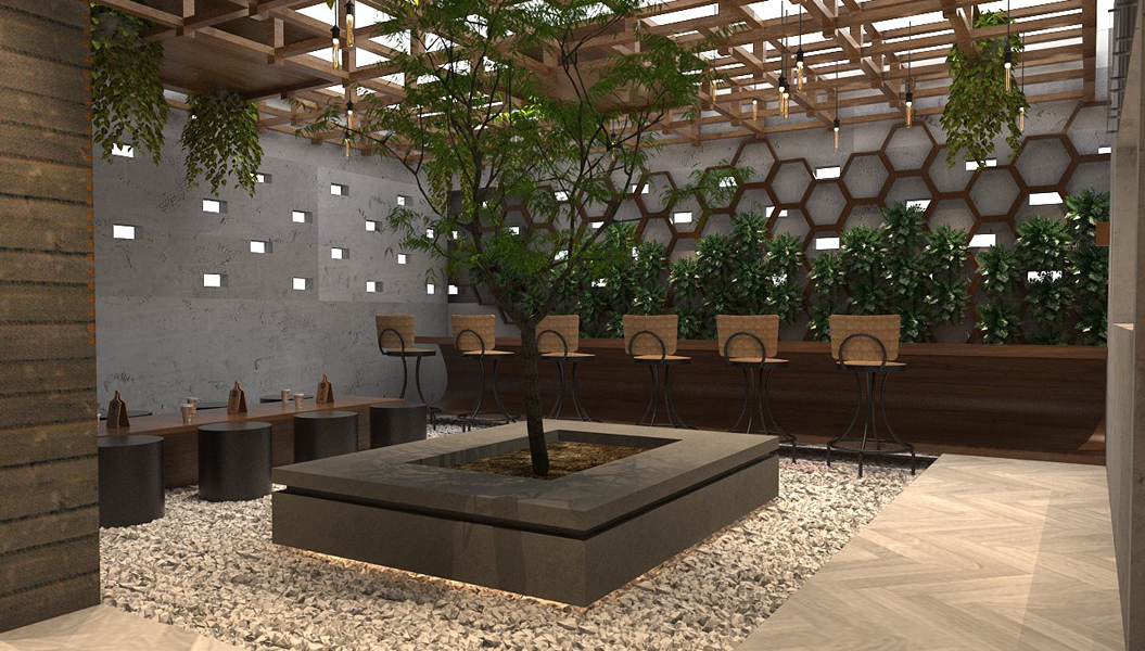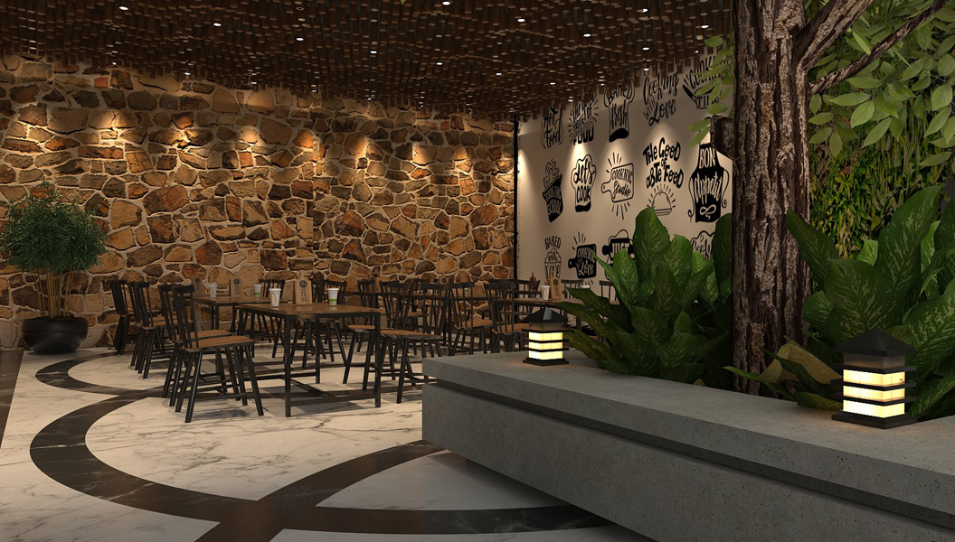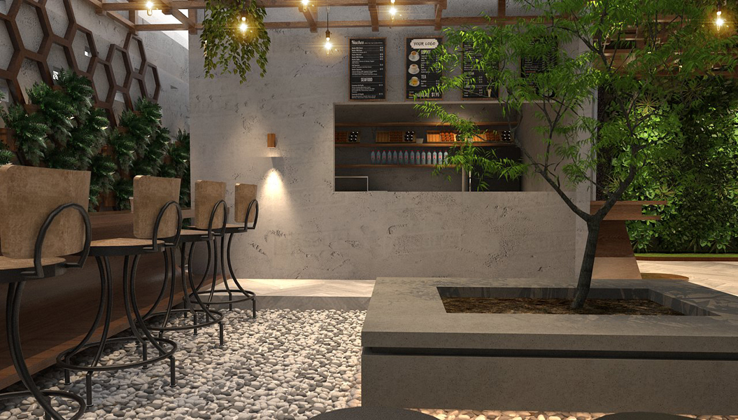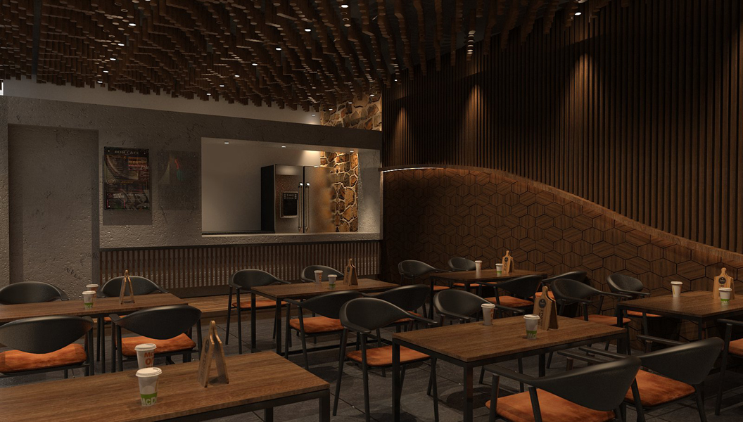 Ambience being an important factor for a café, this design does justice to the look and feel of the space in a budget friendly approach. Stone and cement textured walls with wooden cladding and furniture along with rustic style Interior elements, gives it customers the warmth and comfort in an earthy way. Composed perforations on the wall directs natural light in the space forming canopies on the floor. A simple and subtle flooring design juxtapose the Wooden rafter false ceiling, that acts as a supporting system for hanging plants and creepers.