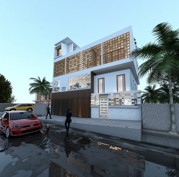 CONCEPT: This duplex house in Bijapur, is covered by the lush green gardens. The inward-outward cuboidal landscapes are connected to the main building with huge windows. Double height spaces with sky-lights introduces natural lighting in the building. Box-windows and cut-outs at different levels, increases the visual connectivity and creates interactive spaces. This 4BHK residence with double height puja and living area, makes the house more spacious and huger. Pocket landscapes and internal balconies with glass bridges adds on the luxury of the building.